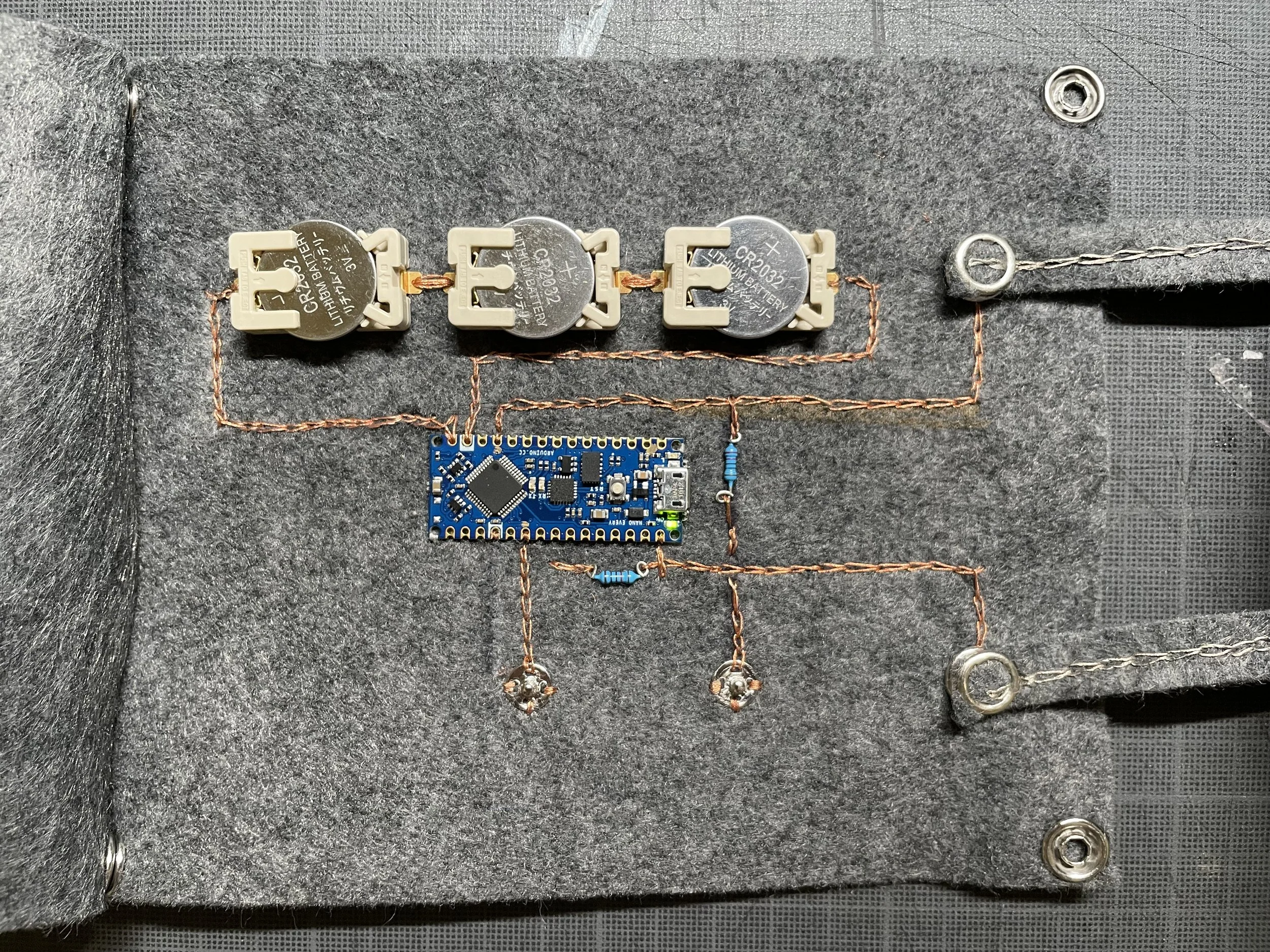 This is a simple circuit made of chained stitched copper thread and Arduino Nana Every a couple of resistors, one LED, and snap buttons. Everything is powered by the 3 3.3V coin cells arranged in series.